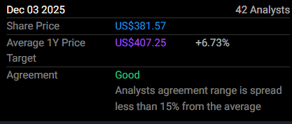Analysts have the company at a target price of US$407 with an implied upside of +6.7%.