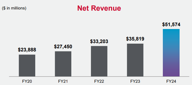 Broadcom has broadly (no pun intended) more than doubled its revenue from 2020 to 2024, as it pivoted hard towards the AI sector. Profits too, has taken the same trajectory, almost doubling from US$3.0 billion to US$5.9 billion over the same period.