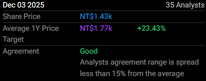 It is currently trading at a PER of 24 times, and analysts have the company at a target price of TW$1,770 with an implied upside of +23%.