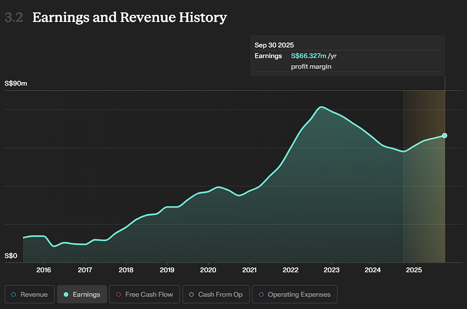 Why we like this: Dividend yield is high at 6.9% and they have just started to distribute dividends. Its earnings have also tripled from SG4.7 million in 2024 to SG$12.9 million in 2025.