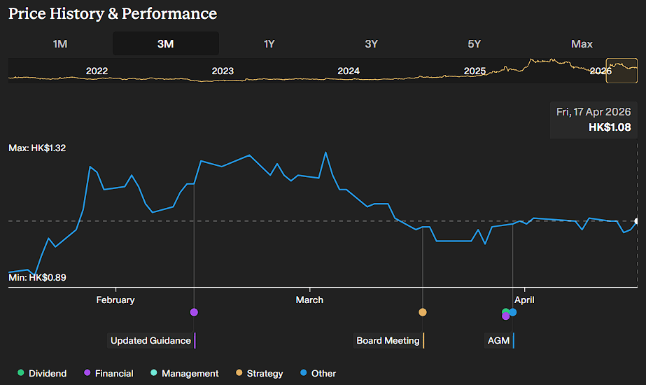 Share price declined by 18% from its peak of HK$1.32 on 3 March to HK$1.08 on 17 April.